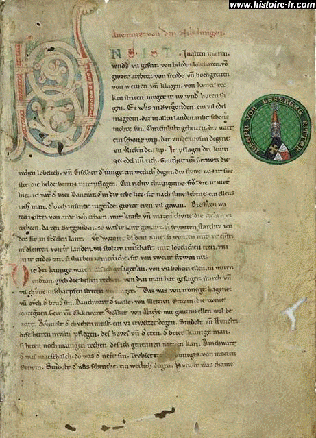 La première page du manuscrit racontant la légende des Nibelungen, XIII° siècle.