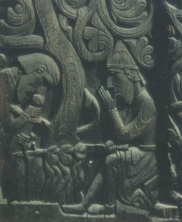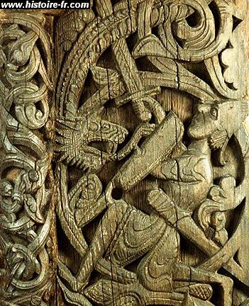 Sigurdr tuant le dragon Fafnir, sculpture sur bois, XIII° siècle.